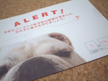いつもお世話になっている動物病院からとどいたフィラリア予防のおしらせハガキです。