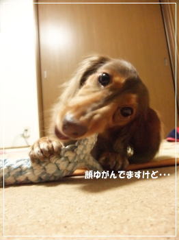 犬のかたちのロープトイに夢中なチョコ。