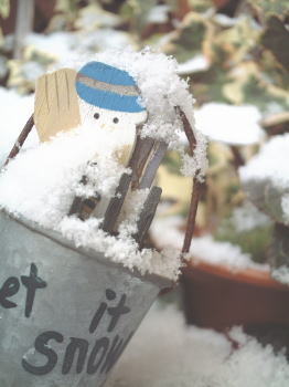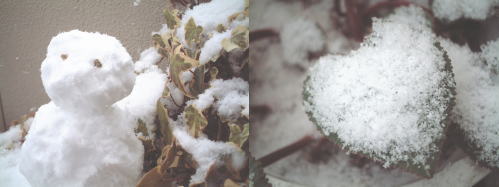雪だるまをつくってみました~シクラメンの葉っぱも雪化粧をして白いハートができてました。