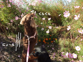背の高いコスモスのにおいかぎするチョコ。にょ~ん